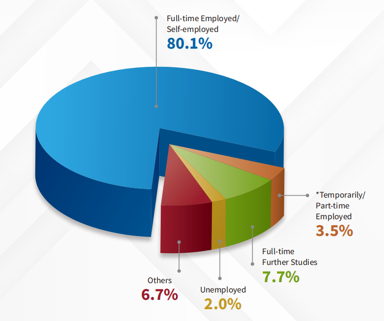 在2021届毕业生中,80.1%选择了直接就业或创业,比重相当之高,甚至比港前三的数据都要出色,不得不说Poly U的学生都是实干型的。同时也有不少毕业生选择了继续深造,占比是7.7%。