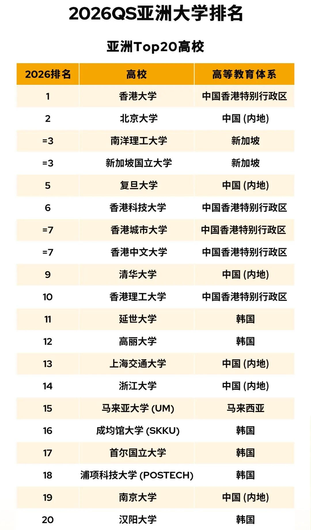 2026QS亚洲大学排名,相比去年,进行了新一轮的大洗牌。中国内地、中国香港特别行政区和新加坡的高校包揽了亚洲排名前十位。
