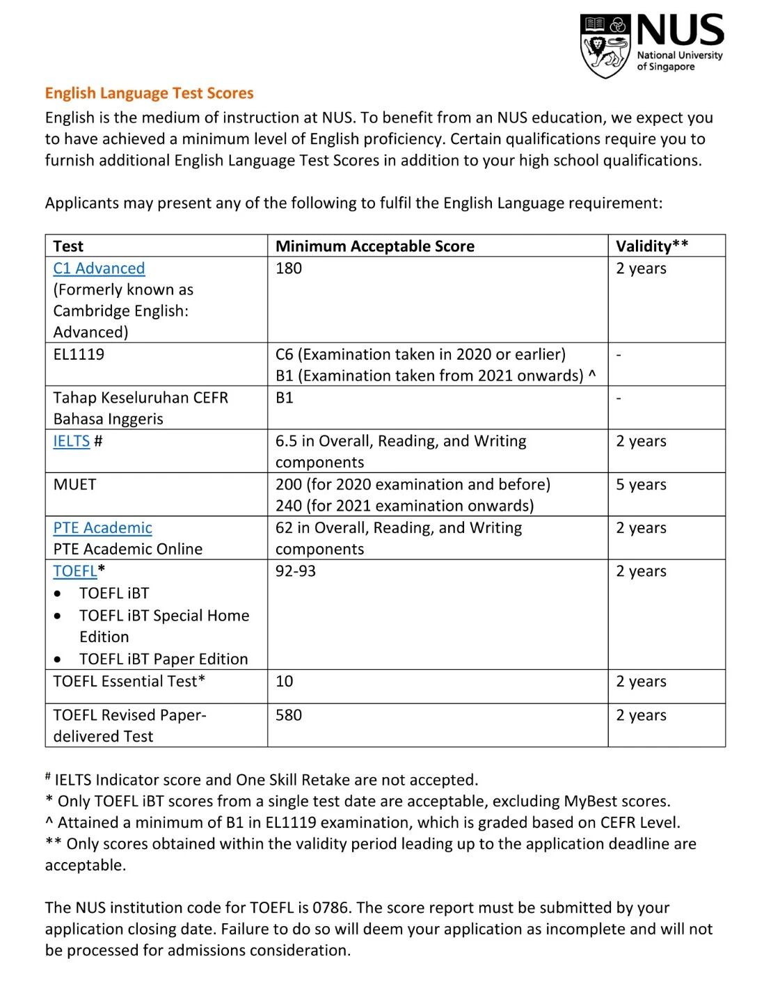 英语是新加坡国立大学(NUS)的教学语言,所以校方要求申请者达到最低的英语 proficiency 水平,可提交以下任意一项英语语言成绩: