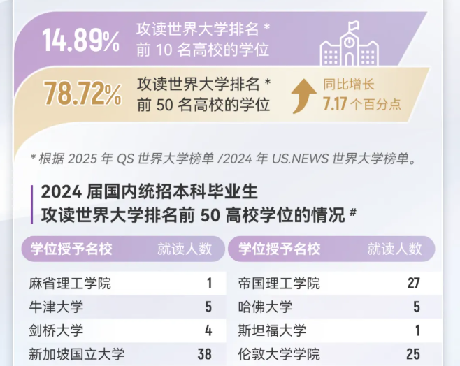深造:2024届国内本科毕业生的升学比例高达84.17%,其中主要以出国出境升学为主,38.26%的升学毕业生选择赴美深造。根据世界大学排名,有78.72%攻读世界大学排名前50名高校的学位,升学的学科选择覆盖广泛,不仅集中于金融、数据科学、计算机科学等热门领域,也在人工智能、生物工程、金融工程等交叉学科中表现出色。